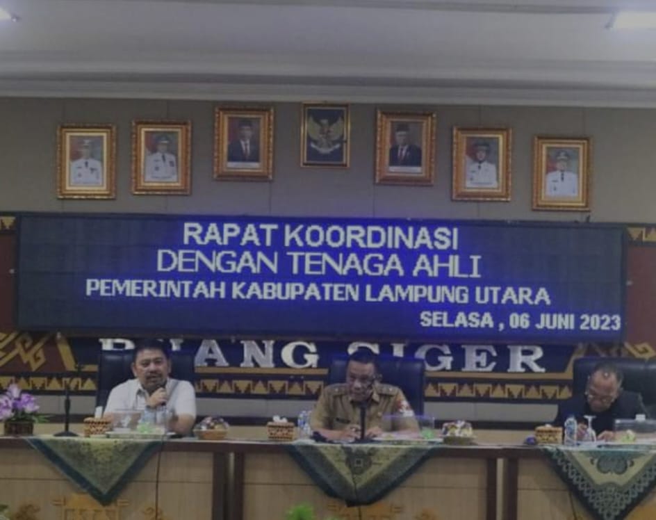 Kegiatan Rakor berlangsung di Ruang Siger Setdakab Lampung Utara, Selasa (06/06/2023). Ketujuh Tenaga Ahli Bupati tersebut yakni, Ir. H. Azwar Yazid, M.M., Tenaga Ahli Pemerintah Kabupaten Lampung Utara bidang Pembangunan; KRT. Oking Ganda Miharja, S.H., M.H., Tenaga Ahli Pemerintah Kabupaten Lampung Utara Bidang Kemasyarakatan dan Sumber Daya Manusia (SDM).