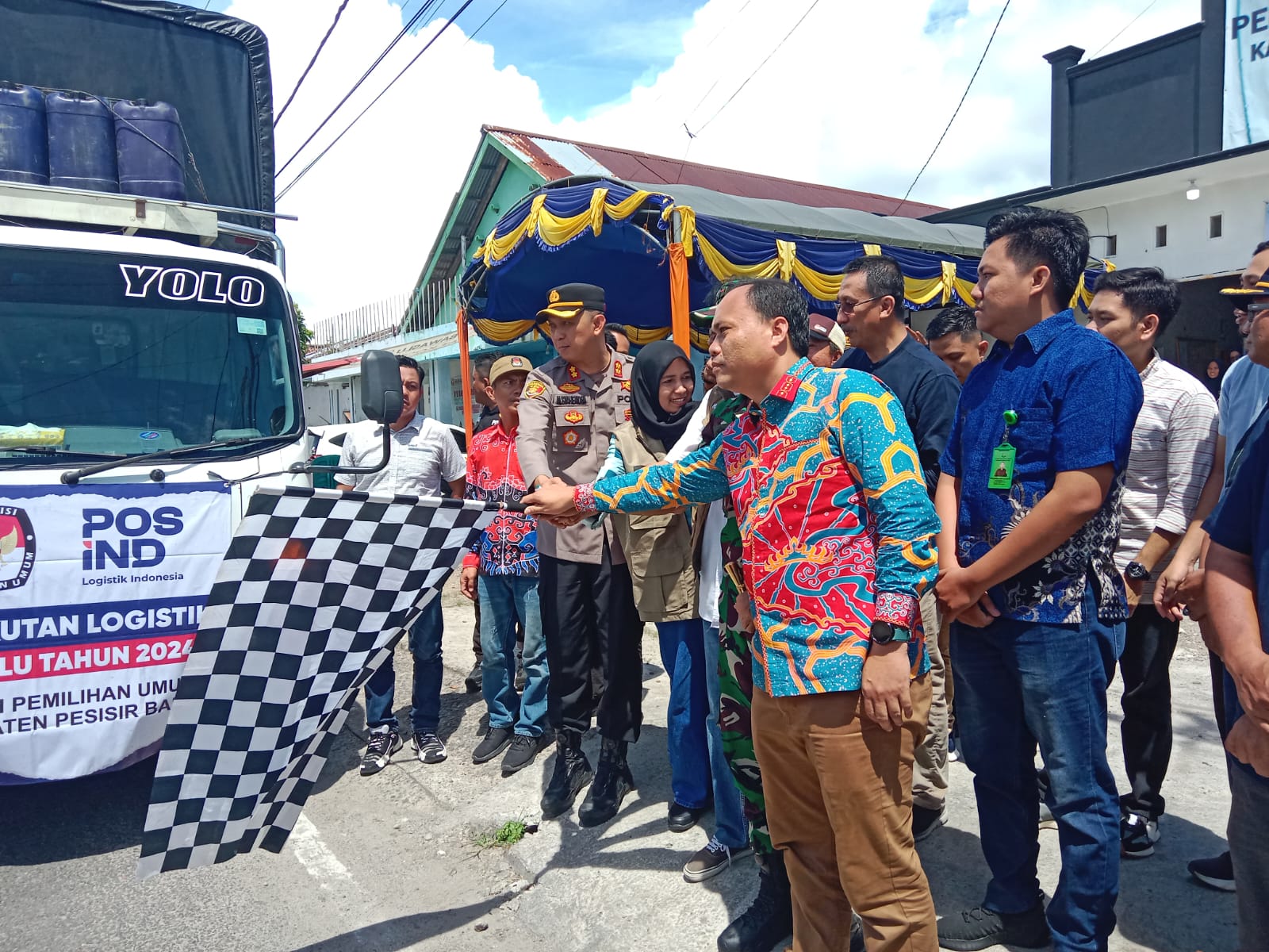 TELISIKMEDIA.COM – Bupati Pesisir Barat (Pesibar), Dr. Drs. Agus Istiqlal, S.H., M.H., menghadiri pelepasan logistik pemilu ke Kecamatan Bangkunat dari Gudang Logistik KPU Pesibar, di Pekon Kampung Jawa Kecamatan Pesisir Tengah, Sabtu (10/2/2024).