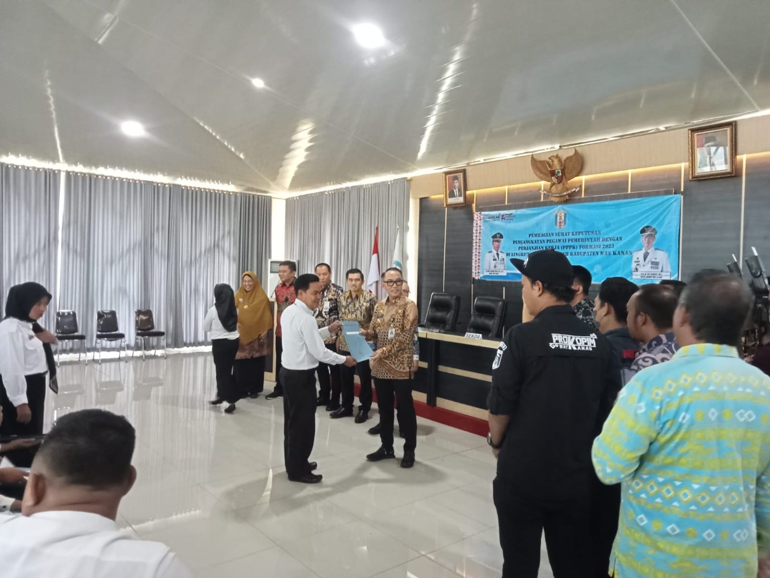 Acara penyerahan SK pegawai PPPK thn 2024 dilaksanakan di ruang Buay Pemuka Pengiran Ilir lt III pada hari Jum’at 15 Maret 2024 dan seluruh pegawai PPPK yang akan diberikan SK dan Nomer Induk semua hadir dan menerima SK langsung secara simbolis dari Bupati