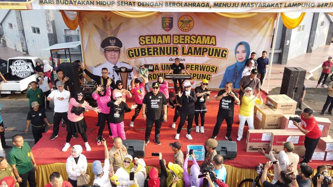 Gubernur Lampung didampingi Ketua Umum Perwosi Provinsi Lampung Riana Sari, Pj. Bupati Lampung Utara Aswarodi, bersama ribuan masyarakat yang hadir memadati halaman Stadion Sukung melakukan Senam Lampung Berjaya.