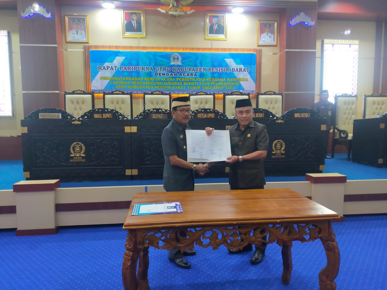 TELISIKMEDIA.COM – Bupati Pesisir Barat (Pesibar), Dr. Drs. Agus Istiqlal, S.H., M.H., menghadiri rapat paripurna Dewan Perwakilan Rakyat Daerah (DPRD) Pesibar dengan agenda penandatanganan dan persetujuan Rancangan Peraturan Daerah (Ranperda) Rencana Pembangunan Jangka Panjang Daerah (RPJPD) Pesibar Tahun 2025-2045, di ruang rapat paripurna DPRD Pesibar, Rabu (10/7/2024).