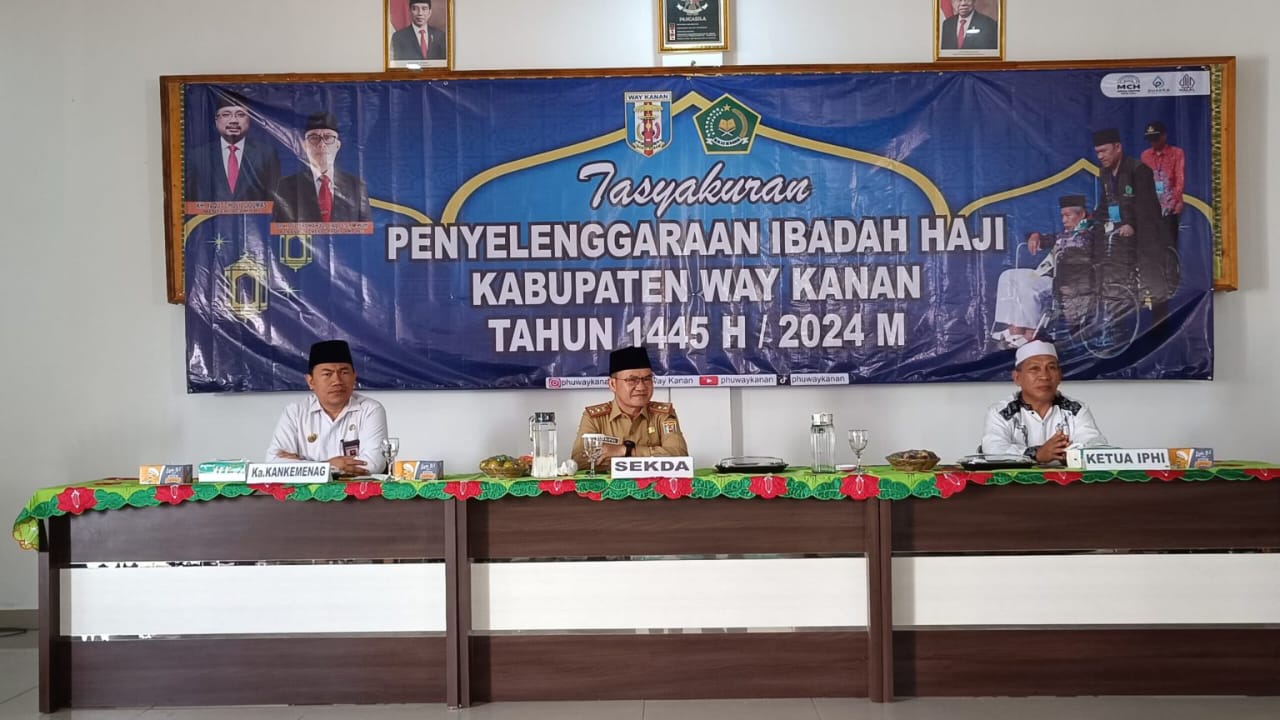 WAY KANAN – Bupati H. Raden Adipati Surya, S.H.,M.M diwakili Sekretaris Daerah Kabupaten, Saipul, S.Sos.,M.IP menghadiri Acara Tasyakuran Penyelenggaraan Ibadah Haji Kabupaten Way Kanan Tahun 1445 H/2024 M di Aula Amal Bhakti Kantor Kementerian Agama Kabupaten Way Kanan, Selasa (06/08/2024).