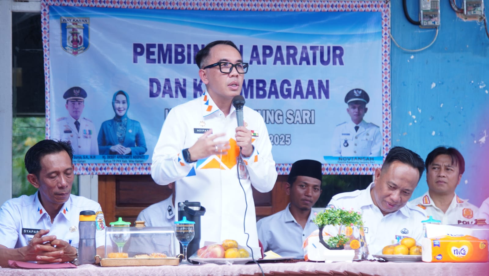 Kegiatan pembinaan tersebut dihadiri oleh Bupati Way Kanan, H. Adipati Surya, S.H., M.M., serta beberapa pejabat lainnya, seperti Inspektur, Kadis PMK, Kasat Pol PP, Camat Blambangan Umpu, Kepala Kampung Tanjung Sari dan Ketua TP-PKK.