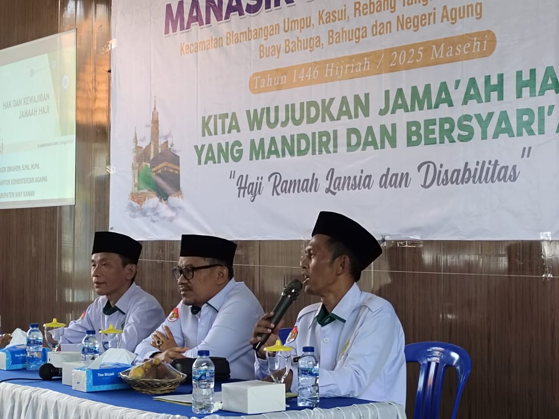 Blambangan Umpu – Kantor Urusan Agama (KUA) Kecamatan Blambangan Umpu menggelar Bimbingan Manasik Haji untuk 8 kecamatan di Kabupaten Way Kanan pada Senin, 14 April 2025. Acara ini dihadiri oleh berbagai pejabat daerah, termasuk Camat Blambangan Umpu, Danramil, Kapolsek, Kepala UPT Puskesmas, Ketua MUI Kecamatan, serta kepala KUA dari beberapa kecamatan.