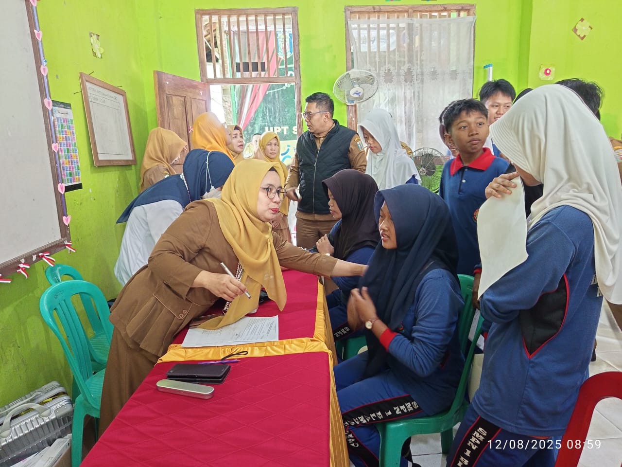 BLAMBANGAN UMPU – Sekretaris Daerah Kabupaten Way Kanan, Machiavelli Herman Tarmizi, S.STP, (tautan tidak tersedia), meninjau kegiatan cek kesehatan gratis untuk siswa sekolah di SMPN 1 Blambangan Umpu, Selasa (12/8/2025).