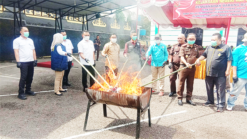 Usai sambutan, kegiatan dilanjutkan dengan pemusnahan barang bukti secara simbolis bersama para tamu undangan. Barang bukti dimusnahkan dengan cara dibakar, dipotong, atau dihancurkan sehingga tidak dapat digunakan kembali. (BL)